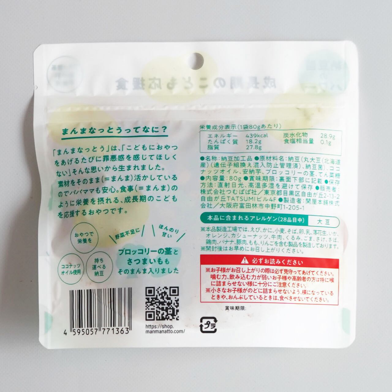 原材料名:納豆(丸大豆(北海道産)(遺伝子組換え混入防止管理済)、納豆菌)、ココナッツオイル、安納芋、ブロッコリーの茎、てん菜糖