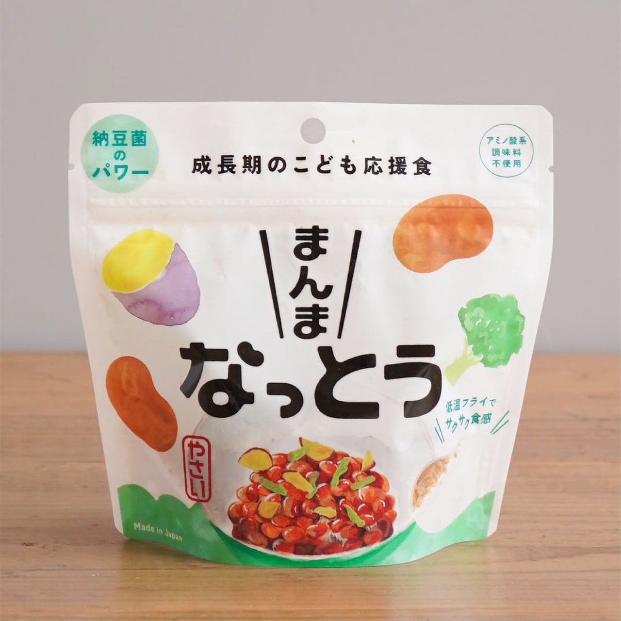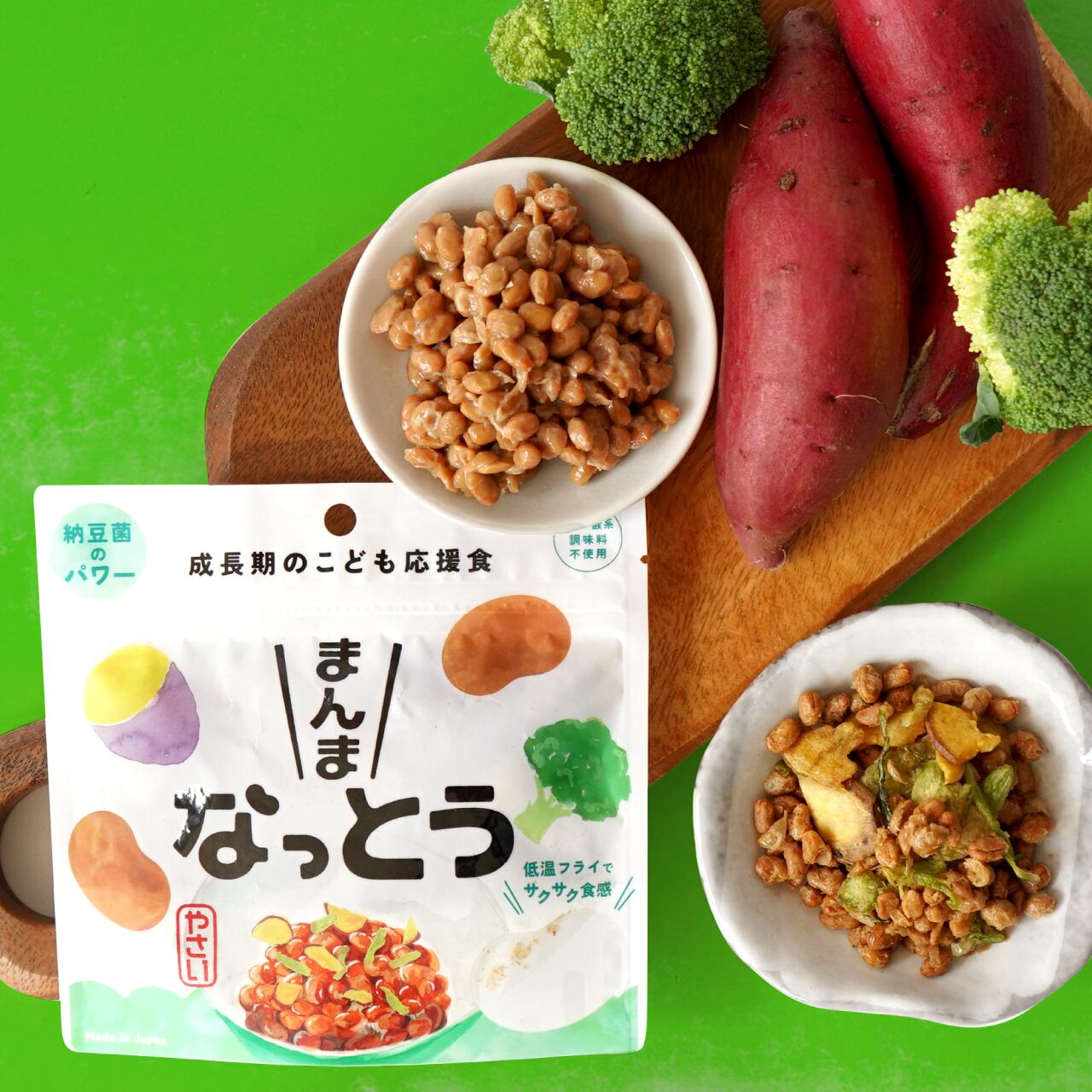 ココナッツオイルでバキュームフライした納豆とお芋・ブロッコリーの茎がミックスされた色んな味が楽しめるお菓子です。サクサクとした食感とほんのりとした甘みが特徴で、においやねばりが気にならないのでお子様でも外出先で手軽に納豆を楽しむことができます。